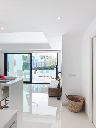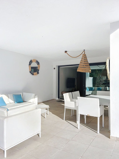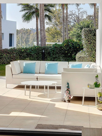 Superb very spacious ground floor apartment in excellent condition in the modern , contemporary new urbanization Terazas de Atalaya ! This apartment is very light and bright thanks to the big living room with large sliding windows overlooking a huge terrace and a big garden, facing west , south-west !