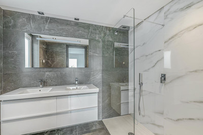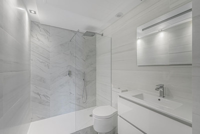 The master suite has doors to the outside, a bathroom ensuite and dressing room; the other two double bedroom share a family bathroom. In addition, the property comes with an underground parking space and private storage room.