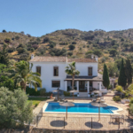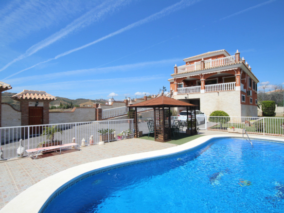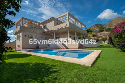 The Spanish style villa with plenty of character is dominating the area from its elevated position and featuring a large basement with a garage, a games room and a storage room on the ground level. On the main middle level we find a reception hall, a large lounge, a dining room, a guest bathroom, a fully equipped kitchen, one bedroom on suite, a lovely covered terrace and a porch. The upper floor comprises a hall, four bedrooms, two bathrooms and a lovely open terrace. The east side of the plot is planted with fruit trees and part of it used as a hen house. On the raised main part of the plot we have a terraced area, a tennis court, a gardened area, a gazebo and a large pool. This quality countryside and very private property facing south has been recently built up to high standards and it is offering breathtaking, mountain, golf, sea and coastal views in all directions as far as the eye can see.