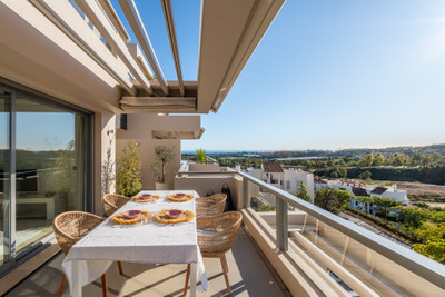 Situated on a high floor, the apartment offers beautiful panoramic views of the mountains, the golf course, and the sea. The spacious terrace is ideal for outdoor dining, sunbathing, or simply unwinding while taking in the spectacular sunsets.