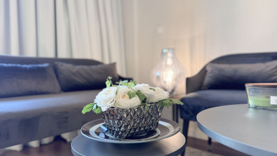 The open-plan living area is thoughtfully designed, offering plenty of storage space, while the second bedroom, separated from the living room by a sliding door, has its own en-suite bathroom.