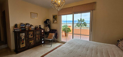 The upper floor features two large bedroom suites, both with built-in wardrobes, and the master bedroom with a dressing area and a large terrace with spectacular views.