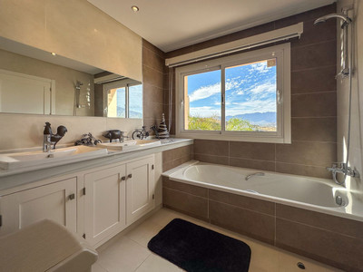 The ground floor offers a bright entrance hall where you'll find the staircase leading both to the first floor as well as the lower level. The ground floor also offers 2 spacious bedrooms with en-suite bathrooms, a guest toilet, a dining area with access to a grand terrace, a kitchen with utility room and a big living room, also giving access to the same terrace. There's a lovely fireplace in the living room, inviting to cozy evenings during the colder months. From the terrace you have plenty of potential lounge-areas from where you can enjoy the incredible views. There's also steps leading to the terrace on the lower level.