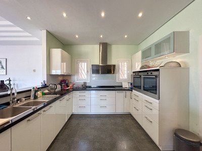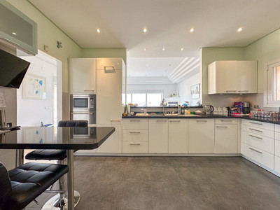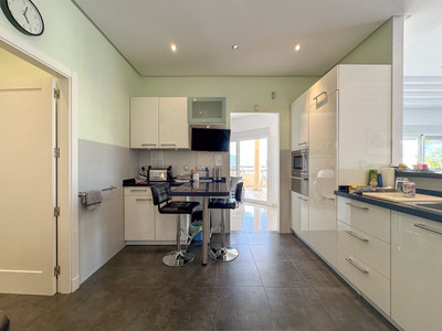 Coming down to the lower level of the villa, you have access to the garage. You'll also find another bedroom (with en-suite bathroom), an additional bathroom, a room functioning as a bedroom, and another living room and kitchen. From both the kitchen, one fo the bedrooms and the en-suite bathroom you can access the downstairs terrace which includes the big saltwater pool and plenty of space for relaxation.