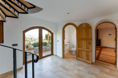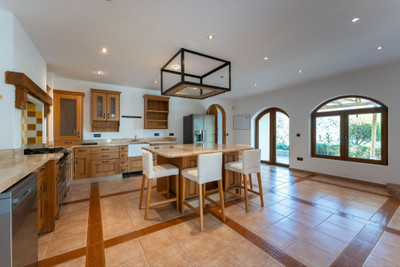 The outdoor spaces are just as impressive, featuring beautifully landscaped gardens, an inviting infinity pool, and several terraces perfect for al fresco dining and enjoying the peaceful surround-ings. A charming pond with a majestic oak tree adds to the idyllic setting. The property also in-cludes a large garage and additional open parking spaces, secured by an automatic entrance gate.