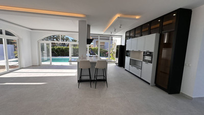 Fully renovated luxury villa on a large private plot with views of the green area in an established and desirable residential area, La Duquesa. This single-story villa has 4 generously sized bedrooms, all with private bathrooms. Spacious open plan living room, brand new high-quality contemporary kitchen with top-of-the-range appliances. The heart of the home centers around a large fireplace and a living area with magnificent sea views. The private pool and terraces are south-facing, enjoy expansive sea and mountain views and are ideal for families and outdoor living. Unique features are the large flat garden ideal for developing or an incredible children's area. Hilltop location overlooking the green zone park to provide tranquility and views. The demanding high-specification finish ensures buyers can simply move in and enjoy life. Solar panels provide heating and hot water, ensuring low energy costs throughout the year. Large windows allow incredible views and a wonderful harmony from the property to the private gardens.