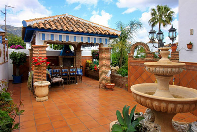 Porch with barbecue area, private garden, and access to the communal pool.