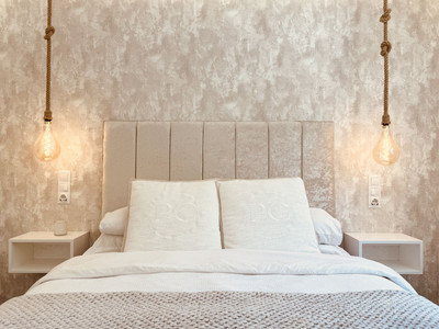 The open-plan living and dining room are bathed in natural light, enhanced by an electric fire for cozy evenings indoors. Access the expansive terrace from here, offering gorgeous sea views and all-day sunshine.
