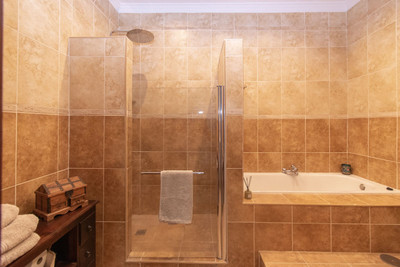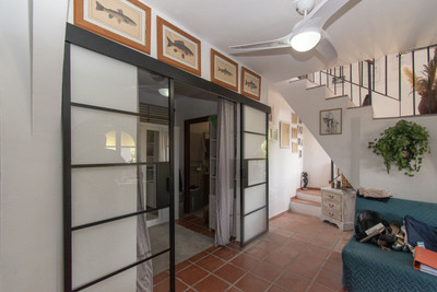 Lovely garden at the entrance, bright living room with a chimney, open plan kitchen, separate dining area with access to a large terrace, 2 double bedrooms with their on-suite bathrooms, 1 single bedroom.