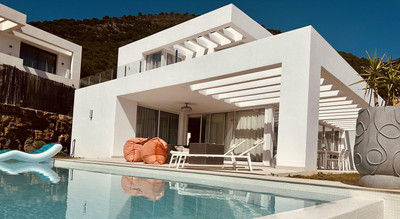The second house features three bedrooms, two bathrooms, a large kitchen-dining area, and a beautiful living room that opens onto the pool. Additionally, it has terraces and a separate utility room.