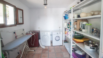 There is a storeroom next to the house with a laundry area.