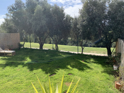 This apartment has a spacious and bright living room and a modern open kitchen. From the living room there is access to the covered terrace and the generous garden overlooking the golf course.