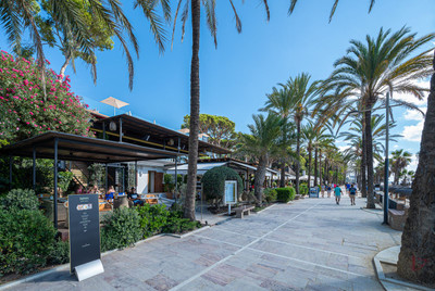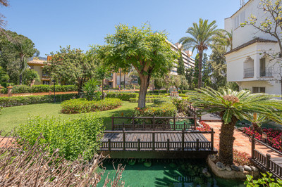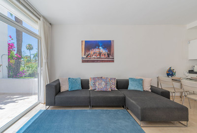 Beautiful one bedroom apartment in Alhambra del Mar on the Golden Mile of Marbella only 100m from the beach promenade and close to all amenities. The apartment consists of a spacious living-dining space with open American kitchen and direct access to a nice terrace with lovely views to the tropical garden of the complex. Furthermore there is a good size bedroom with bathroom and a small dressing area en suite. It is surrounded by the lush gardens and fountains of the Alhambra del Mar urbanization which evoke a permanent feeling of holidays and breathing space. With all amenities at hand and just a few metres from the beach, Capuccino and at walking distance to Marbella centre, the apartment offers an excellent location and a rare opportunity to live by the sea. Includes a good sized storage in the basement.