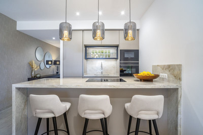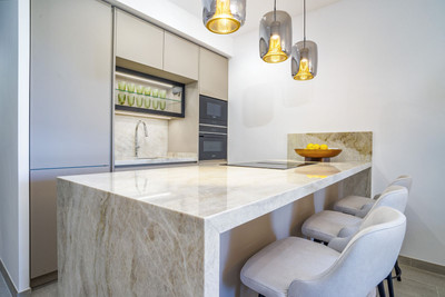 The interior is equally impressive, with ceramic flooring throughout and large fitted wardrobes offering ample storage space. The kitchen features elegant marble worktops paired with high-end Siemens appliances, including a washing machine and dryer. Electric shutters in all rooms provide added comfort and security.