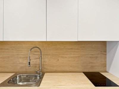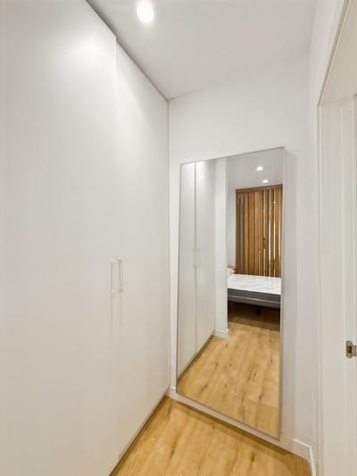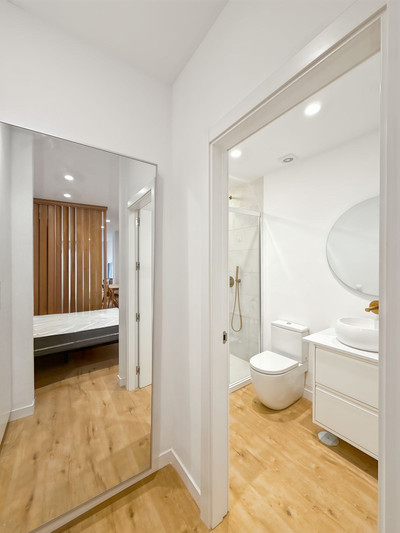 As you step inside, you're welcomed by an open-plan layout, featuring an elegant and functional kitchen seamlessly integrated with the living and sleeping area. Light wood flooring and neutral tones create a serene and sophisticated atmosphere. The bathroom, with its sleek design and gold accents, adds a touch of luxury to the space.