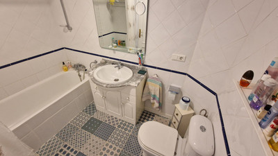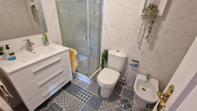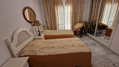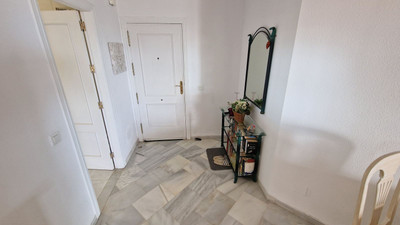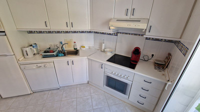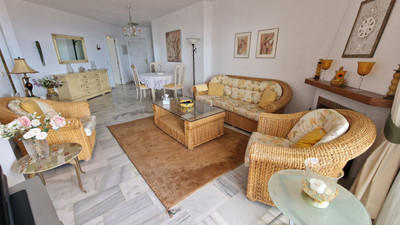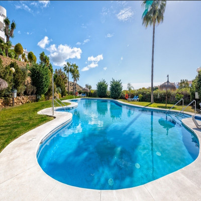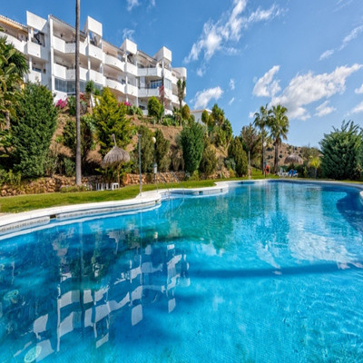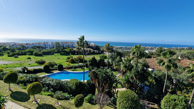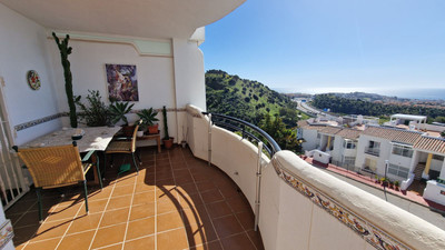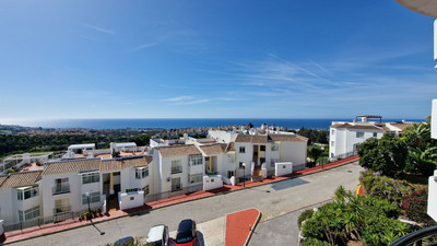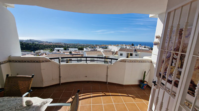 Apartment in Calahonda, Mijas Costa, facing south and offering a stunning view to the sea! Located about 4km from the beach, this apartment is part of a community offering communal parking, gardens and two pool areas. The apartment offers a large living room leading to a open terrace with spectacular sea views, two bed rooms, two bathrooms and a large kitchen with a laundry room. Close to Málaga city and the airport and just 20 minutes away by car from Marbella.