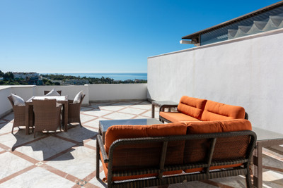 Spacious first floor apartment with panoramic sea views, three double ensuite bedrooms, a large lounge, separate kitchen and utility room, as well as a large terrace. Centrally located within a high end urbanisation within walking distance of the amenities of Marbella old town, in one of the best areas of the Costa del Sol, the apartment boasts impressive views, and oversize rooms throughout.
