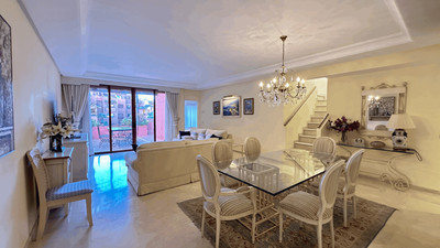 Spanning a built area of 301m², this penthouse encompasses a spacious interior of 168m² and an expansive terrace of 121m². The accommodation includes three generously sized bedrooms, each with its own en-suite bathroom. The bathrooms are designed for comfort, including underfloor heating for added luxury. The open-plan living spaces are complemented by an abundance of natural light, marble floors, and elegant glass doors. A fully fitted kitchen, complete with modern appliances, is paired with a fully furnished interior for immediate convenience.