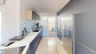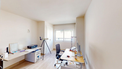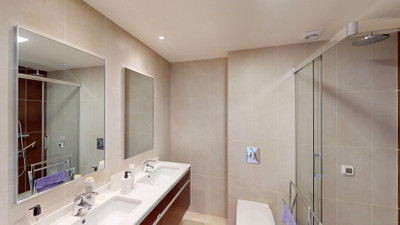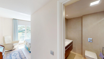 This contemporary penthouse in Mijas, Málaga, offers a harmonious blend of comfort and style. It is located directly on a golf course and offers an impressive view of the sea, so you can enjoy both the tranquillity of the green and the panorama of the coast. The open-plan living area features floor-to-ceiling windows that flood the space with natural light and provide stunning panoramic views of the surrounding landscape. The living room is tastefully furnished with a plush white sectional sofa, accented by vibrant area rugs that add warmth to the polished floors. The sleek kitchen boasts modern navy cabinetry contrasted with white countertops and high-end stainless steel appliances, creating a sophisticated culinary space. The penthouse's three bathrooms are elegantly appointed, with one showcasing a floating double vanity in rich wood tones and a glass-enclosed shower. The primary bedroom is a serene retreat with direct access to a private terrace. It features a canopied bed, a spacious walk-in closet, and a luxurious en-suite bathroom with both a bathtub and a shower. The second bedroom offers equally impressive views and is furnished with a comfortable double bed. A dedicated office space provides a functional work area with a modern desk setup and ample natural light. The crowning feature of this property is the private terrace, complete with a swimming pool and expansive views of the surrounding hills and greenery. Additionally, the penthouse includes two parking spaces and two storage rooms. Residents also have access to excellent communal amenities, including a large swimming pool, a heated pool, and an outdoor kitchen that can be used by everyone. With its thoughtful layout, luxurious amenities, and prime location in Urbanización Cerrado del Águila, this penthouse offers a perfect balance of indoor comfort and outdoor living in the heart of Costa del Sol. We are pleased to be able to present this dream property to you soon, either personally or via virtual viewing. Because this world is unique – just like our Axarquía. In Andalusia. On the Costa del Sol. Here, on the sunny side of life…