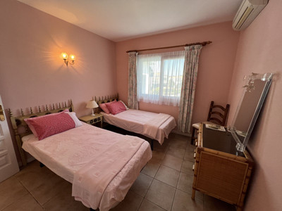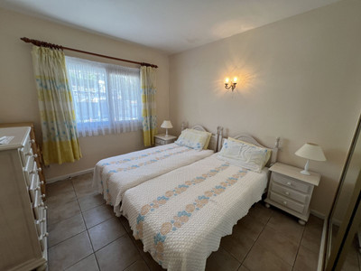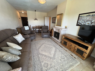 Even though the apartment is on the top floor, there are just a couple of steps to walk up in order to reach the front door. Inside the kitchen is fully equipped and offers plenty of cupboard space. The living / dining room has aircon and working fireplace and leads out to the south facing terrace which has a beautiful outlook over the pool and community gardens, and also offers a glimpse of the sea. If so desired, there would be scope to open up the space to incorporate the kitchen into one larger space.