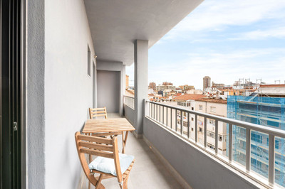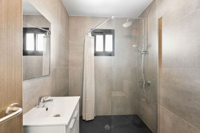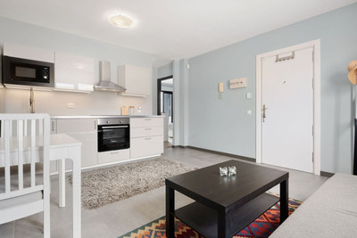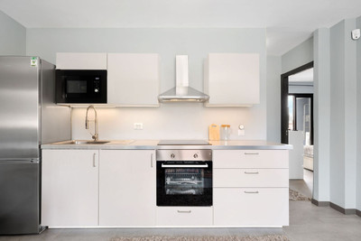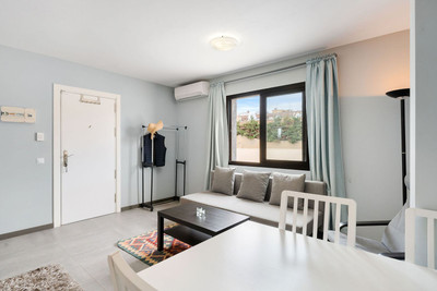 The property offers an open-plan kitchen and living room space. The kitchen is modern and compact, complete with all the essentials for cooking, plus a breakfast bar or small dining area that connects with the living space. The living room has a cozy setup, with enough space for a comfortable sofa and a couple of accent chairs. Large windows bring in plenty of natural light and offer views over the mountains and Fuengirola’s charming buildings and bustling streets.