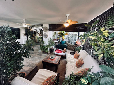 Stairs from this landing go to the huge roof terrace which is divided into a cosy chillout area and an outside kitchen. There is a split level which is structurally prepared to withhold the weight of a small splash pool or a jacuzzi/hot tub. From here, another flight of stairs takes us to the top terrace which boasts stunning mountain and village views.